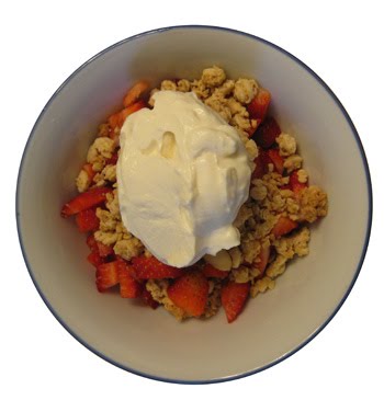 1 cup of chopped strawberries. 1/4 cup of granola. 2 dollops of greek yogurt.